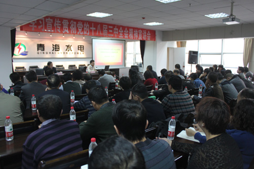 12月5日上午,青海水電集團(tuán)召開(kāi)學(xué)習(xí)宣傳貫徹黨的十八屆三中全會(huì)精神宣講會(huì)。省委講師團(tuán)團(tuán)長(zhǎng)郭云甫同志作宣講報(bào)告。集團(tuán)黨委書(shū)記、董事長(zhǎng)唐增科同志主持宣講會(huì),總經(jīng)理王海青和集團(tuán)班子其他成員李傳強(qiáng)、吳世周、徐強(qiáng)、李建民、姚鐵兵同志,各成員企業(yè)在寧的負(fù)責(zé)同志和黨群部門負(fù)責(zé)人、黨員代表,以及集團(tuán)本部機(jī)關(guān)干部職工共70余人聆聽(tīng)宣講。